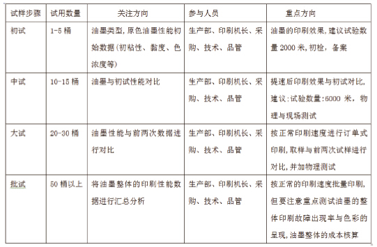 在這個試樣的環(huán)節(jié)上,我們企業(yè)采購部或技術(shù)部、品管部、生產(chǎn)部,要詳細(xì)做好試樣產(chǎn)品的質(zhì)量、印刷數(shù)據(jù)、產(chǎn)品工藝數(shù)據(jù),可以為后續(xù)的油墨質(zhì)量跟蹤提供數(shù)據(jù),以此檢測供應(yīng)商產(chǎn)品的質(zhì)量穩(wěn)定性。在試樣期間,我們建議油墨供應(yīng)商的技術(shù)服務(wù)人員,全程與企業(yè)生產(chǎn)技術(shù)人員溝通,如果能夠做到產(chǎn)前油墨操作與知識的培訓(xùn),正確規(guī)范的使用油墨,對軟包裝企業(yè)整體技能操作有所提升,將是油墨供應(yīng)商和企業(yè)的雙贏。