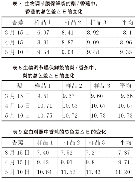 由上表可知,隨著時間的增長,總色差均增加,但梨/香蕉搭配生物調節膜保鮮袋的總色差則變化較小。