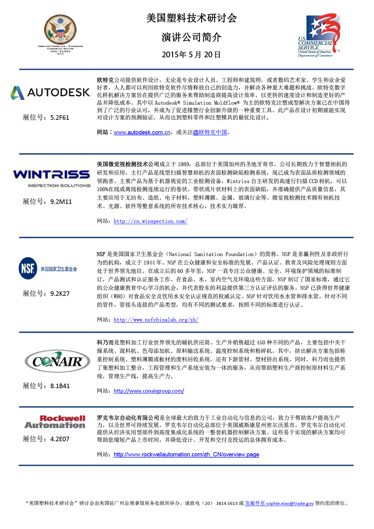 敬請于2015年5月15日前回復(fù)至美國駐廣州總領(lǐng)事館商務(wù)處肖衍華女士(電話:020-38145613,傳真:020-38145310,郵箱:sophie.xiao@trade.gov )確認(rèn)您的出席。