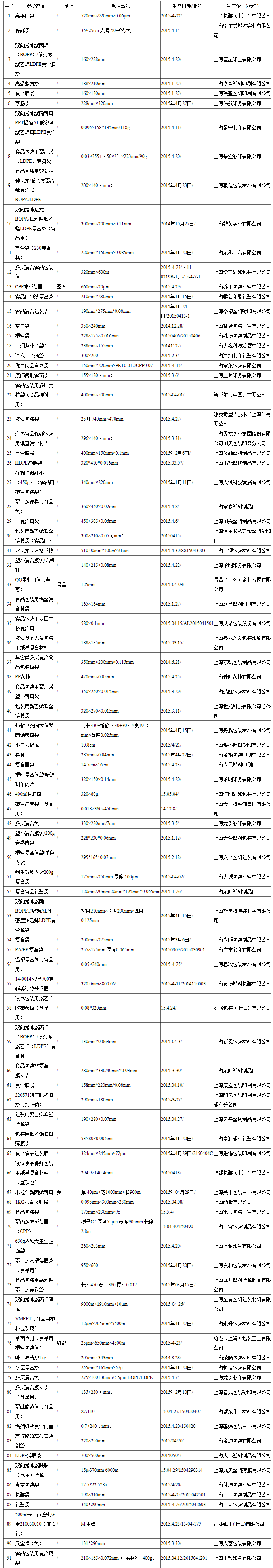 2015年上海市食品用塑料包裝膜袋質(zhì)量專項監(jiān)督抽查實物質(zhì)量合格的產(chǎn)品和企業(yè)名單
