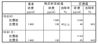 表1為回收裝置的排氣濃度。經測算發現,回收裝置剛購買時,處理廢氣能力很強,廢氣去除率高達96.2%,高于目標值90%。回收裝置使用半年后,廢氣去除率為94.5%,凈化效果隨時間延長有下降趨勢,但依然很好。