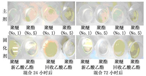 由圖4~圖7可知,回收乙酸乙酯溶劑無論是與聚醚還是與聚酯混合,混合液顏色均有點發黃,但與脂肪族固化劑混合后,混合液顏色無明顯變化。