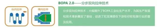 分步法所制備的尼龍薄膜,厚薄均勻性和高延展性相較于第一代吹膜法尼龍薄膜有了顯著的提升,而且機(jī)械強(qiáng)度較高,且分步雙向拉伸技術(shù)制備的BOPA薄膜產(chǎn)量有了顯著提升,從而大幅度提升了BOPA薄膜的工業(yè)生產(chǎn)力水平,對(duì)BOPA薄膜在下游彩印軟包裝行業(yè)的普及應(yīng)用起到了極大的促進(jìn)作用。