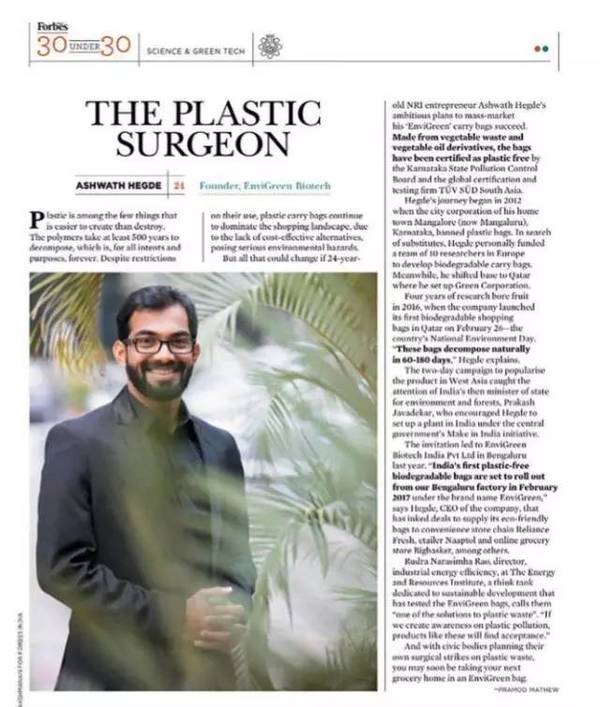 這位笑嘻嘻的小伙Ashwath Hedge,(同樣是來自印度的小哥)可不是為了嘩眾取眾,他的腦子也沒燒壞,就是這款塑料袋,讓他年僅24歲便創立EnviGreen公司,當起了CEO,眾多國家找上門來。