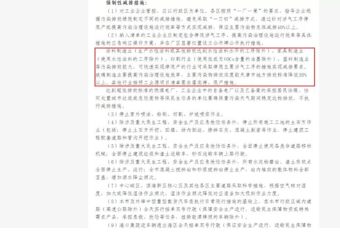 涂料制造業(生產水性涂料或其他排放達到水性涂料水平的工序除外)、家具制造業(使用水性涂料的工序除外)、印刷行業(使用低或無VOCs含量的油墨除外)、塑料制造業等污染排放較大、可快速實現停限產的行業可采取停限主要涉氣工序的措施實現減排要求。玻璃制造業要提高污染治理設施效率,主要污染物排放濃度較天津市地方排放標準降低30%以上。其他行業按照工業源項目清單要求落實停、限產措施。