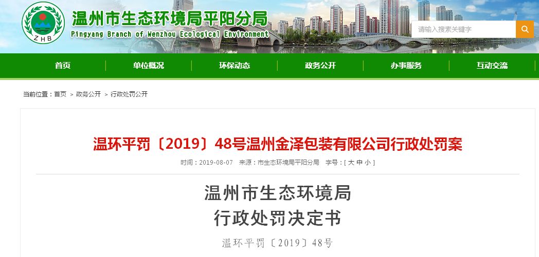8月7日,溫州市生態環境局公布了溫州金澤包裝有限公司的行政處罰決定書,據決定書了解,該企業未向環境保護行政主管部門報批環境影響評價文件,于2019年6月擅自創辦印刷包裝項目,主體工程正在建設,未投入生產。因此,溫州市生態環境局對其處以罰款24000元。