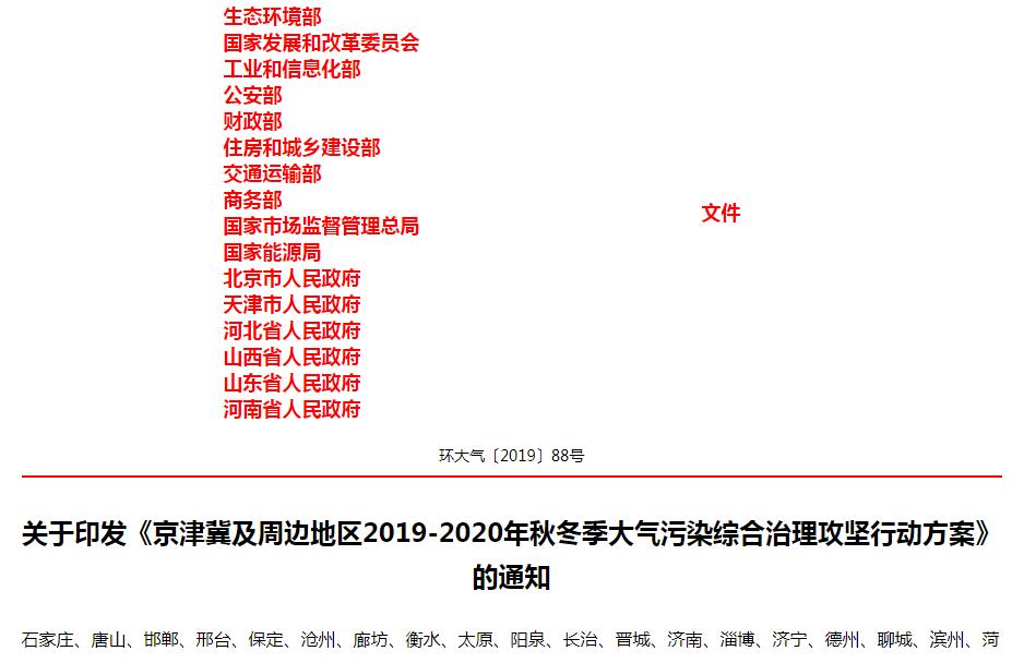 近日,生態(tài)環(huán)境部、國(guó)家發(fā)展和改革委員會(huì)、工業(yè)和信息化部、公安部、財(cái)政部、住房和城鄉(xiāng)建設(shè)部、交通運(yùn)輸部、商務(wù)部、國(guó)家市場(chǎng)監(jiān)督管理總局、國(guó)家能源局、北京市人民政府、天津市人民政府、河北省人民政府、山西省人民政府、山東省人民政府、河南省人民政府聯(lián)合發(fā)文,印發(fā)《京津冀及周邊地區(qū)2019-2020年秋冬季大氣污染綜合治理攻堅(jiān)行動(dòng)方案》(以下簡(jiǎn)稱《方案》)的通知。