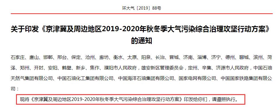 京津冀及周邊地區(qū)2019-2020年秋冬季大氣污染綜合治理攻堅(jiān)行動(dòng)方案