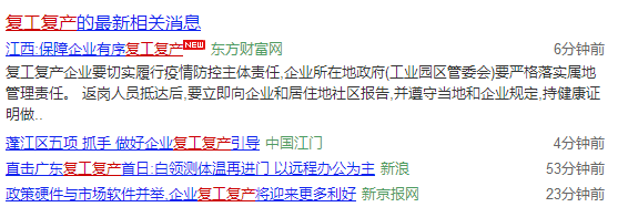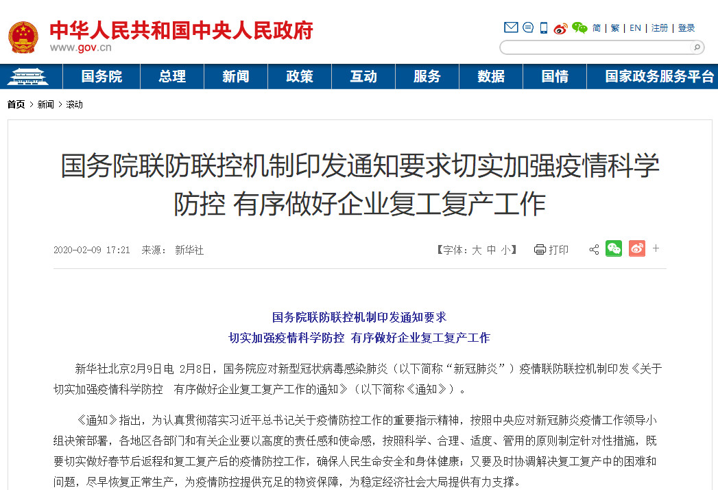 河南、廣東等30個省市政府已經下達了相關的復工復產指導通知,要求返崗員工上下班佩戴口罩并接受體溫監測,情況有異即刻上報。開工期間,要對廠區、車間、電梯等人員聚集的場所、設施設備進行消毒清潔,并加強車間區域的通風。企業食堂錯峰就餐,在吃飯的最后一刻才脫口罩,避免面對面就餐,避免就餐說話,避免扎堆就餐。大多企業因疫情停工停產一周,生活必需品、醫療物資等缺乏供應。據悉,目前國內的口罩生產企業復工率高達73%,天然氣、成品油供應充足,民航、鐵路運營正常。