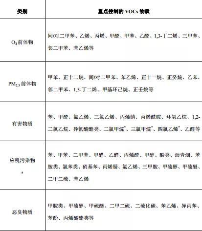 新一輪VOCs治理工作,綜合考慮VOCs活性物質(zhì)、有害物質(zhì)、惡臭物質(zhì)等的協(xié)同控制,詳情見下表。