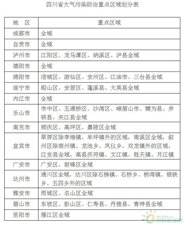 執(zhí)行地區(qū)為《四川省打贏藍(lán)天保衛(wèi)戰(zhàn)實施方案》劃定的省大氣污染防治重點區(qū)域,涉及15市77縣(市、區(qū)),具體名單見附件。