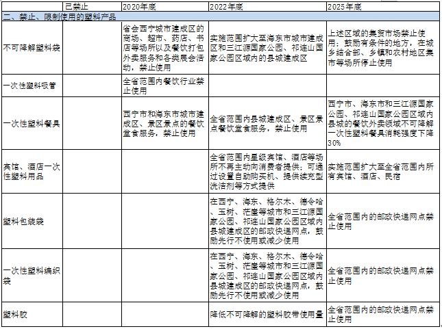 一次性塑料餐具:到2020年底,全省范圍內餐飲行業禁止使用不可降解一次性塑料吸管;西寧市和海東市城市建成區、景區景點的餐飲堂食服務,禁止使用不可降解一次性塑料餐具。到2022年底,全省范圍內縣城建成區、景區景點餐飲堂食服務,禁止使用不可降解一次性塑料餐具。到2025年,西寧市、海東市和三江源國家公園、祁連山國家公園區域內縣城的餐飲外賣領域不可降解一次性塑料餐具消耗強度下降30%。