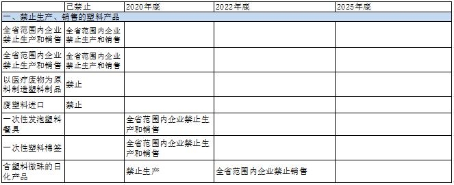 全省范圍內企業禁止生產和銷售厚度小于0.025毫米的超薄塑料購物袋、厚度小于0.01毫米的聚乙烯農用地膜。禁止以醫療廢物為原料制造塑料制品。全面禁止廢塑料進口。到2020年底,全省范圍內企業禁止生產和銷售一次性發泡塑料餐具、一次性塑料棉簽;禁止生產含塑料微珠的日化產品。到2022年底,全省范圍內企業禁止銷售含塑料微珠的日化產品。