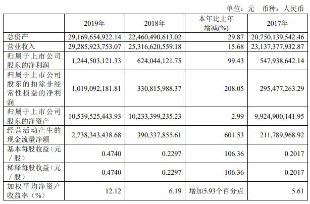 2019年,實現營業收入292.86億元,同比增長15.68%,實現歸屬于上市公司股東的凈利潤12.45億元,同比增長99.43%,歸屬于上市公司股東的扣除非經常性損益的凈利潤10.19億元,同比增長208.05%,基本每股收益為0.4740元,同比增長106.36%,加權平均凈資產收益率12.12%,同比增加5.93個百分點。公司經營活動產生的現金流量凈額為27.38億元,公司資產總額為291.70億元,負債總額為184.63億元,歸屬于母公司所有者權益總計105.40億元,資產負債率為63.30%。