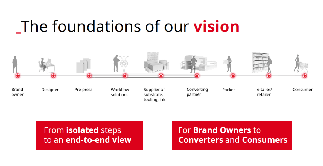 大大小小的品牌所有者都面臨著來自本地和全球的競爭對手,以及不斷變化的市場期望的壓力。他們面臨著許多挑戰(zhàn),例如更短的上市時間,更小的批量,以及建立線下銷售和線上銷售之間一致性的需求。當前的包裝價值鏈仍然非常分散,其過程中的每個階段都被隔離為多個孤島。全新的要求,希望所有關鍵參與者都具有“端到端”的視角。印刷商和加工商則希望消除生產操作中的浪費和失誤。