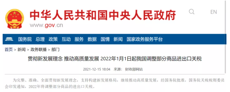 12月15日,經國務院批準,國務院關稅稅則委員會印發通知,2022年將調整部分商品的進出口關稅。