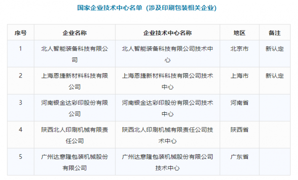 綜上,自本通知印發(fā)之日起,全部國家企業(yè)技術(shù)中心為1714家、分中心為113家。其中,涉及到印刷包裝及相關(guān)設(shè)備器材企業(yè)的名單具體如下: