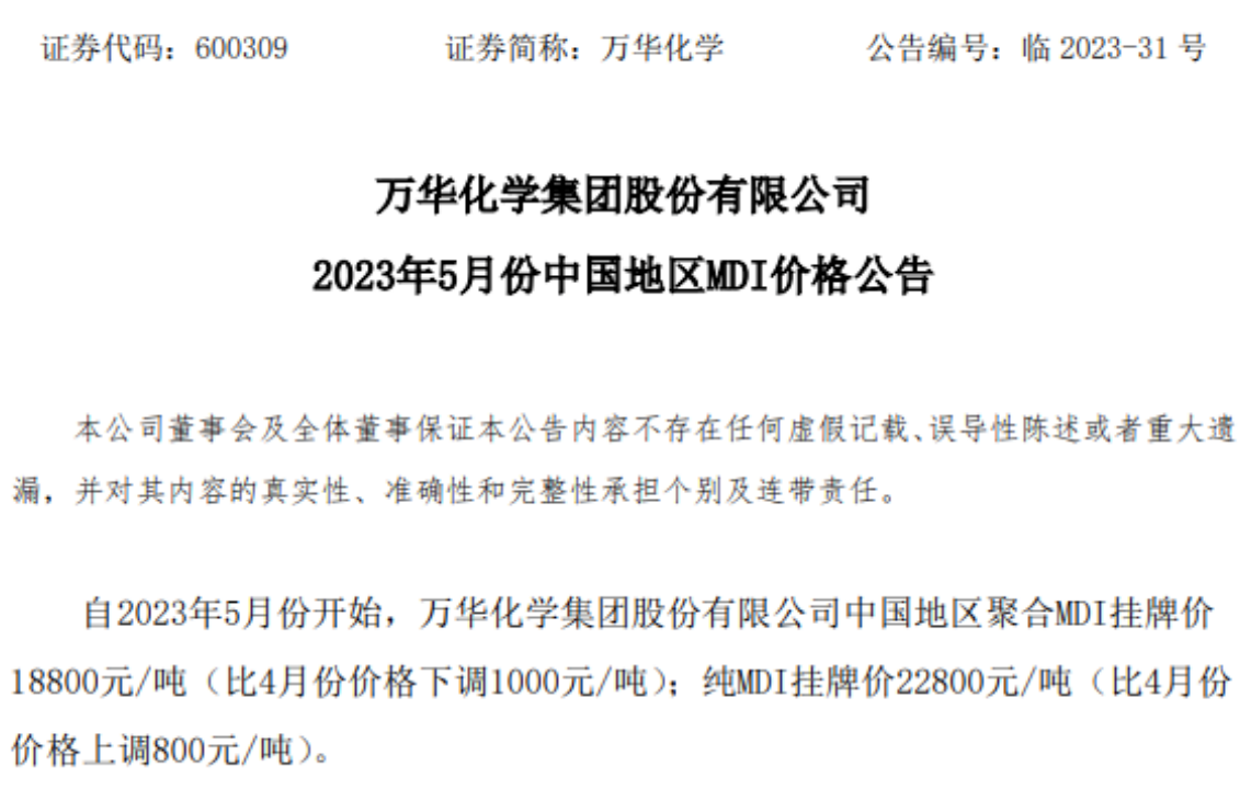 4月28日,萬華化學集團股份有限公司發布公告稱:自2023年5月份開始,萬華化學集團股份有限公司中國地區聚合MDI掛牌價 18800元/噸(比4月份價格下調1000元/噸);純MDI掛牌價22800元/噸(比4月份價格上調800元/噸)。
