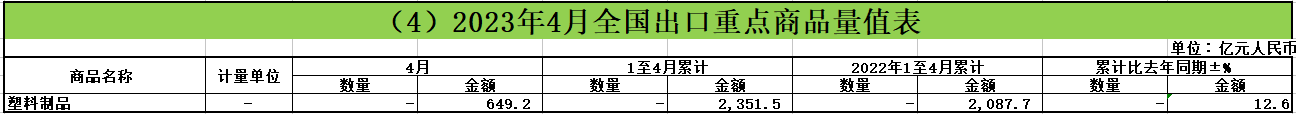 塑料制品:2023年4月,塑料制品出口金額為649.2億元;1-4月累計出口金額為2,351.5億元(2022年1-4月累計出口金額為2,087.7億元),累計比去年同期增長12.6%。