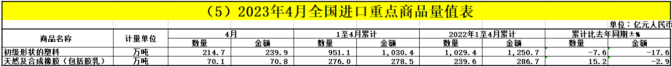 近期,海關總署發布2023年4月全國進口重點商品量值表(人民幣值),其中,塑料、橡膠方面的進出口情況如下: