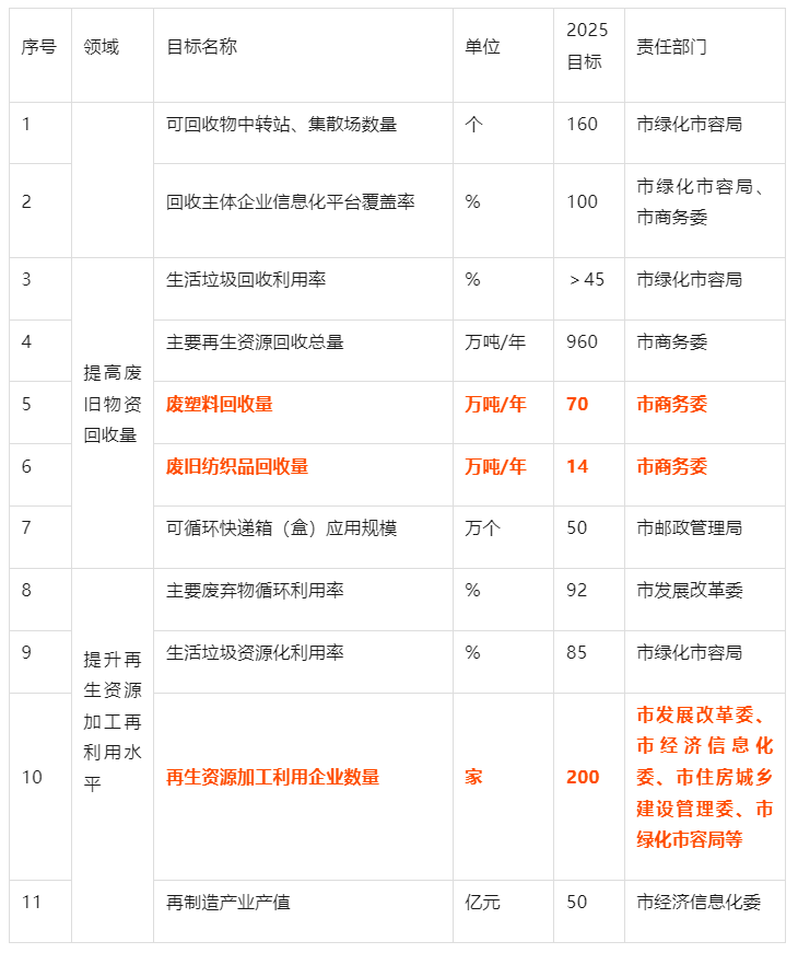 3.計(jì)劃到2025年,廢塑料回收量達(dá)到70萬噸/年;廢舊紡織品回收量達(dá)到14萬噸/年;