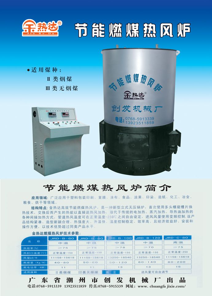 金熱達高效節能燃煤熱風爐,是一種新型立式無壓鍋爐,首次使用多頭螺旋槽片換熱技術,交換后而產生的熱能以直接送熱風加熱,取代于傳統的電加熱、蒸汽加熱、導熱油加熱的各種間接加熱方式,管道熱風溫度在正常溫度-300℃之間自由設定,該產品結構緊湊、造型新穎合理、熱強度大、升溫快、溫度控制穩定、效率高、且經濟效益好、安裝和操作方便,以技術優勢超過同類產品水平。