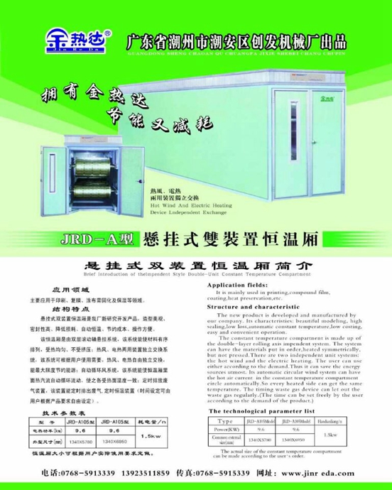 結構特點:懸掛式雙裝置恒溫廂是我廠新研究開發產品,造型美觀、密封性高、降低損耗、自動恒溫、節約成本、操作方便;該恒溫廂是由雙層滾動軸懸掛系統,該系統能使材料有序排列,受熱均勻、不受擠壓;熱風、電熱兩用裝置獨立交換系統,該系統可根據用戶使用需要,熱風、電熱自由獨立交換,能最大限度節約能源;自動循環風系統,該系統能使恒溫廂里面熱氣流自動循環流動,使之各受熱面溫度一致;定時排放廢氣裝置,該裝置能定時排出廢氣(時間設定可由用戶根據產品要求自由設定)
